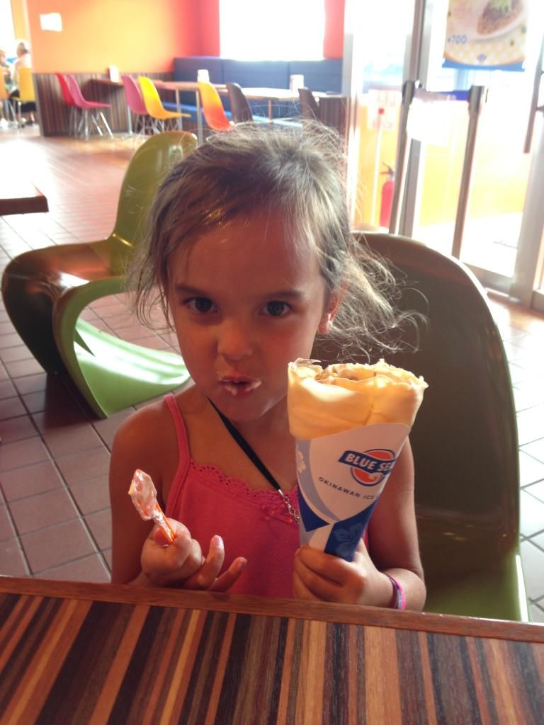 This past week, she went to school from 9 until 4:30. Most days she doesn't nap, but I think the quiet time is a good break, regardless. She loves school and doesn't complain about going or staying all day. She has learned to write her name in Japanese (yay for 3-letter names!) and is starting to learn some vocabulary and songs. They have water play every Tuesday and Thursday, so she wears her bathing suit to school and they have some pools that they fill up. They get lots of outside time despite the heat, and she comes home happy.